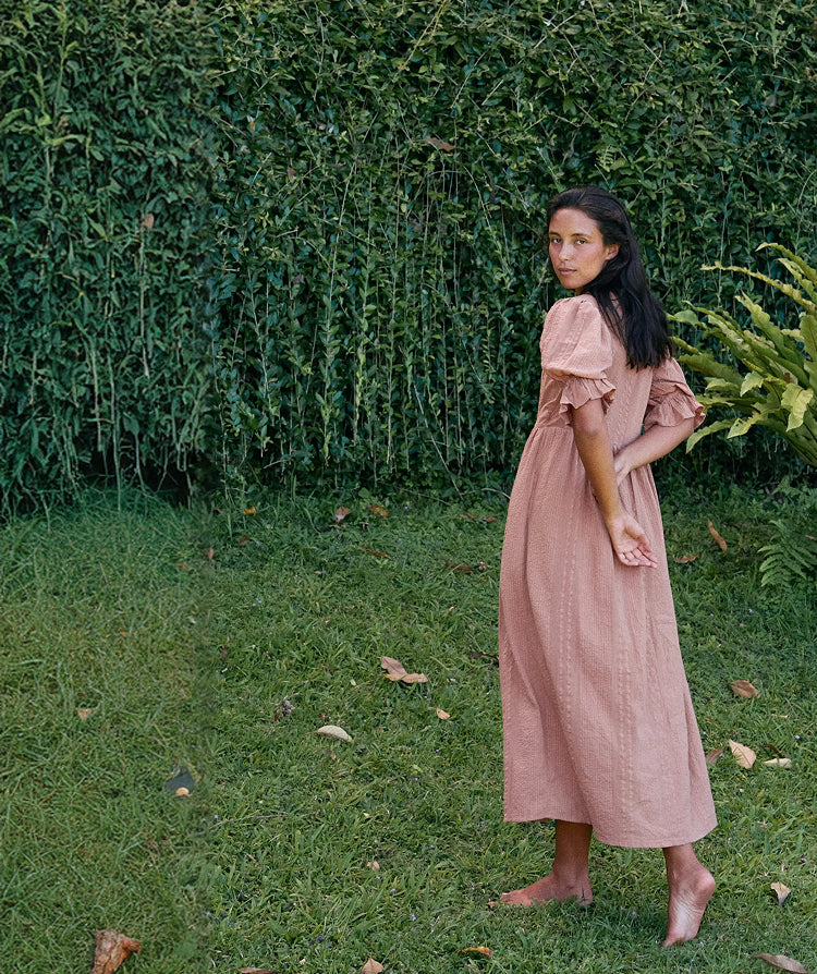 Daughters of India Kyra Midi Dress in Musk — studio with straw hat, side profile, hand screen print cotton Daughters of India Kyra Midi Dress in Musk — studio back close-up with straw hat, billowed sleeves, gathered waist