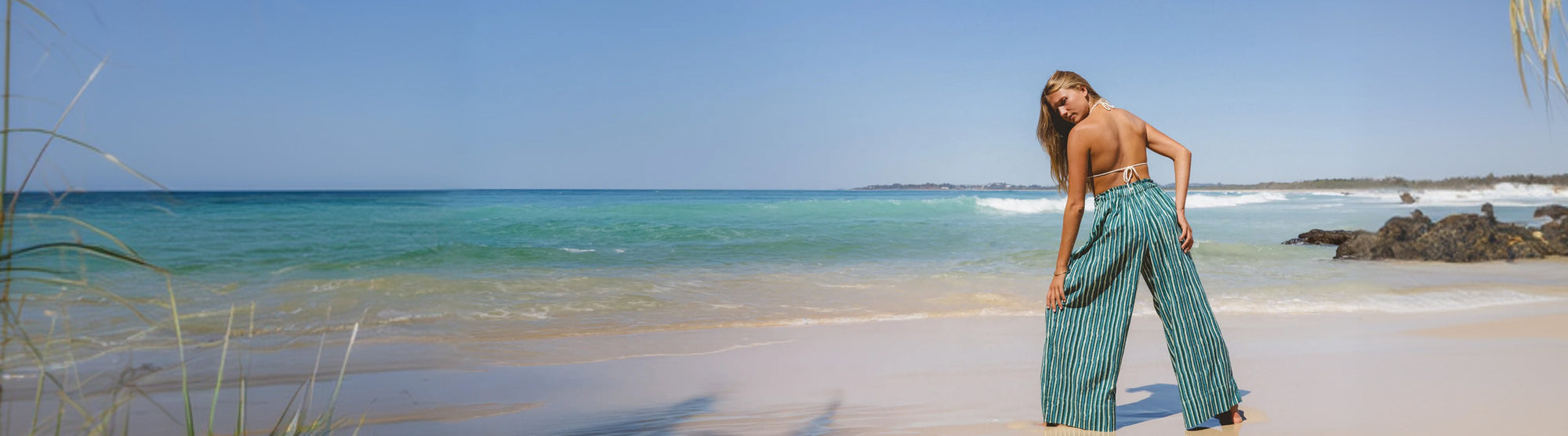 Ria Pants Cherry Blossom — outdoor rocky setting portrait, model wearing cherry blossom hand block print cotton wide-leg pants, pink floral motif on cream, barefoot styling, artisan Jaipur India | Daughters of India Ria Pants Cherry Blossom — beach full length front view, model wearing cherry blossom hand block print cotton wide-leg pants on sandy shore, pink floral motif on cream, artisan Jaipur India | Daughters of India