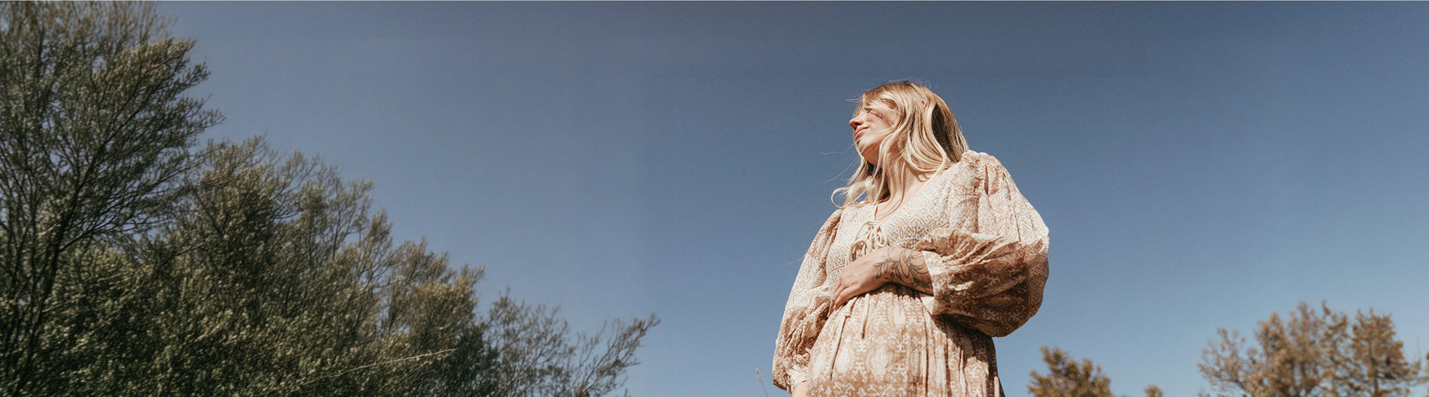 Daughters of India Jasmine Midi Dress in Shell — full length on rocky shore, hand screen print cotton with balloon sleeves Daughters of India Jasmine Midi Dress in Shell — over-shoulder glance on coastal rocks, balloon sleeve detail