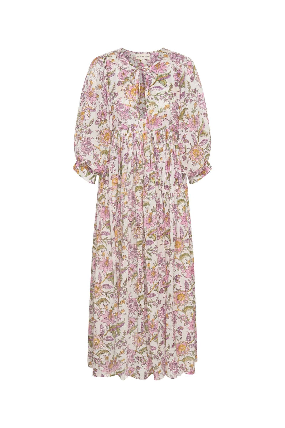 Fuchsia Bloom is an enchanting illustration of the ancient art of hand-block printing. An eloquent display of flowers and leaves intertwine in this traditional design, creating an effervescent feel through its delicately hand-placed floral garden. Crafted from soft, lightweight cotton voile, our Kyra Maxi captures the very essence of femininity with its romantic billowed sleeves and optional front-tie detailing. The addition of pockets compliments this maternity and breast-feeding friendly design, boasting effortless everyday wear and timeless style.