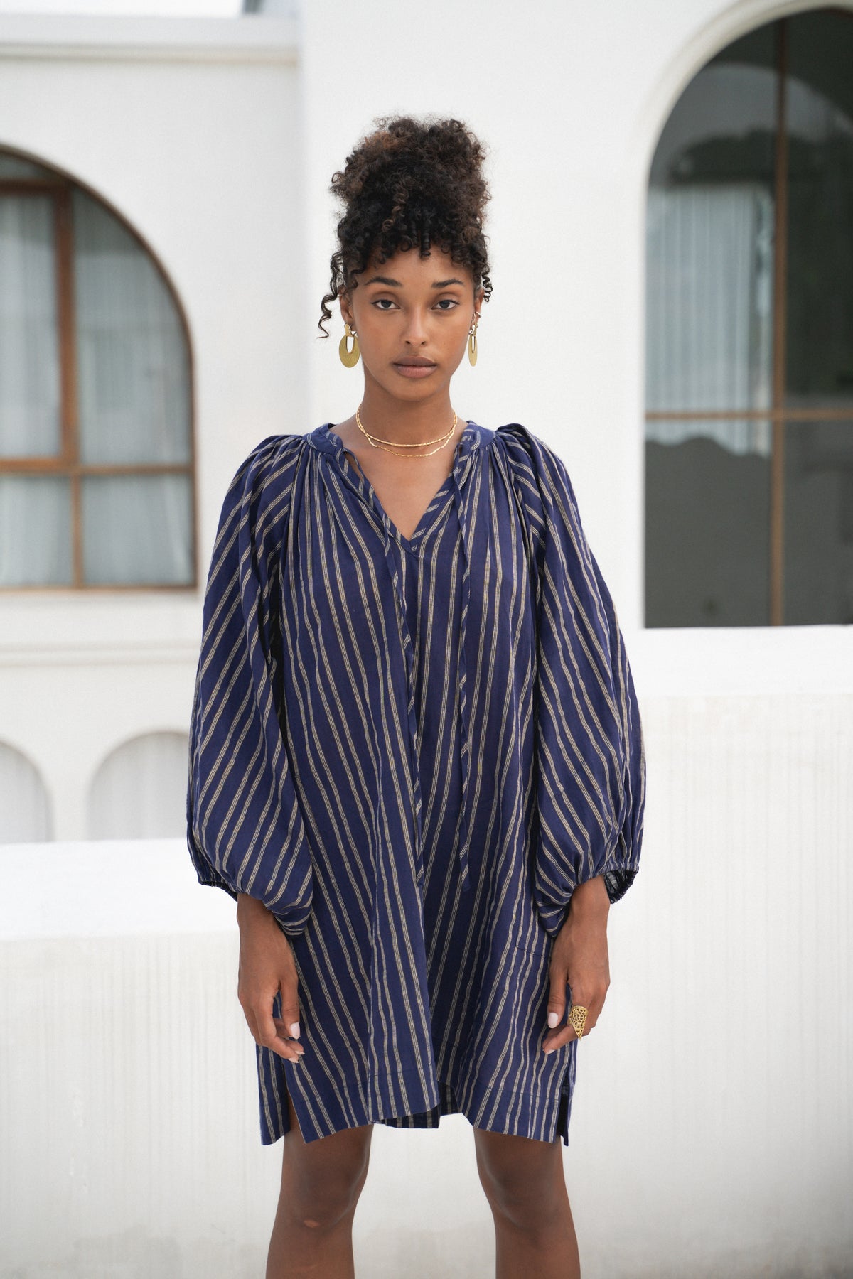 Inspired by a vintage silhouette, and crafted with handloom fabric ~ a rare and exclusive sustainably handmade textile in modern times. This intentionally oversized mini dress design features a poet-style collar with optional tie, romantic billowy sleeves finished with soft elasticated cuffs, and pockets at the hip. The Sapphire blue fabric features lines of gold lurex and white detailing, adding a touch of sparkling elegance.