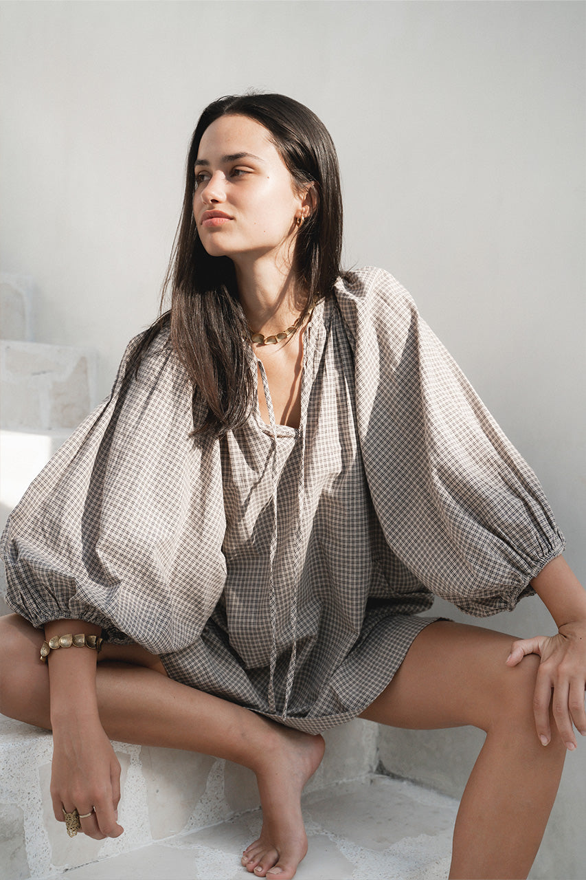 Inspired by a vintage silhouette, and crafted with handloom fabric ~ a rare and exclusive sustainably handmade textile in modern times. Featuring a flowy oversized mini length design with a classic poet-style collar and optional tie, romantic billowy sleeves finished with soft elasticated cuffs, and pockets at the hip in a beautiful fine chequered Taupe colour-way.