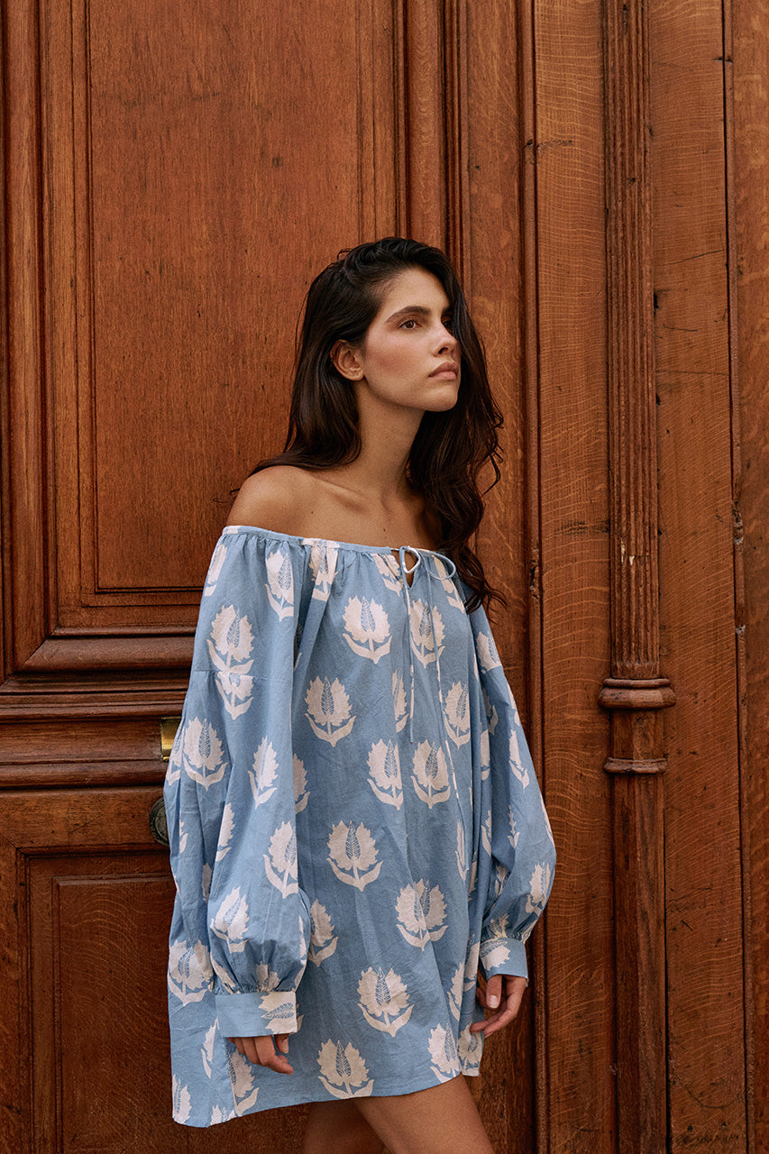 Crafted from 100% cotton, the Ria Mini Dress offers a relaxed, thigh-length fit, with the addition of adjustable gathering at the neckline with a tie. In the sweetest sky blue adorned with a white floral print, Ria delivers the perfect amount of vintage character. Featuring a low scooped neck, pockets, and our signature billowing sleeves finished with a cuff, to compliment this classic oversized-style dress.