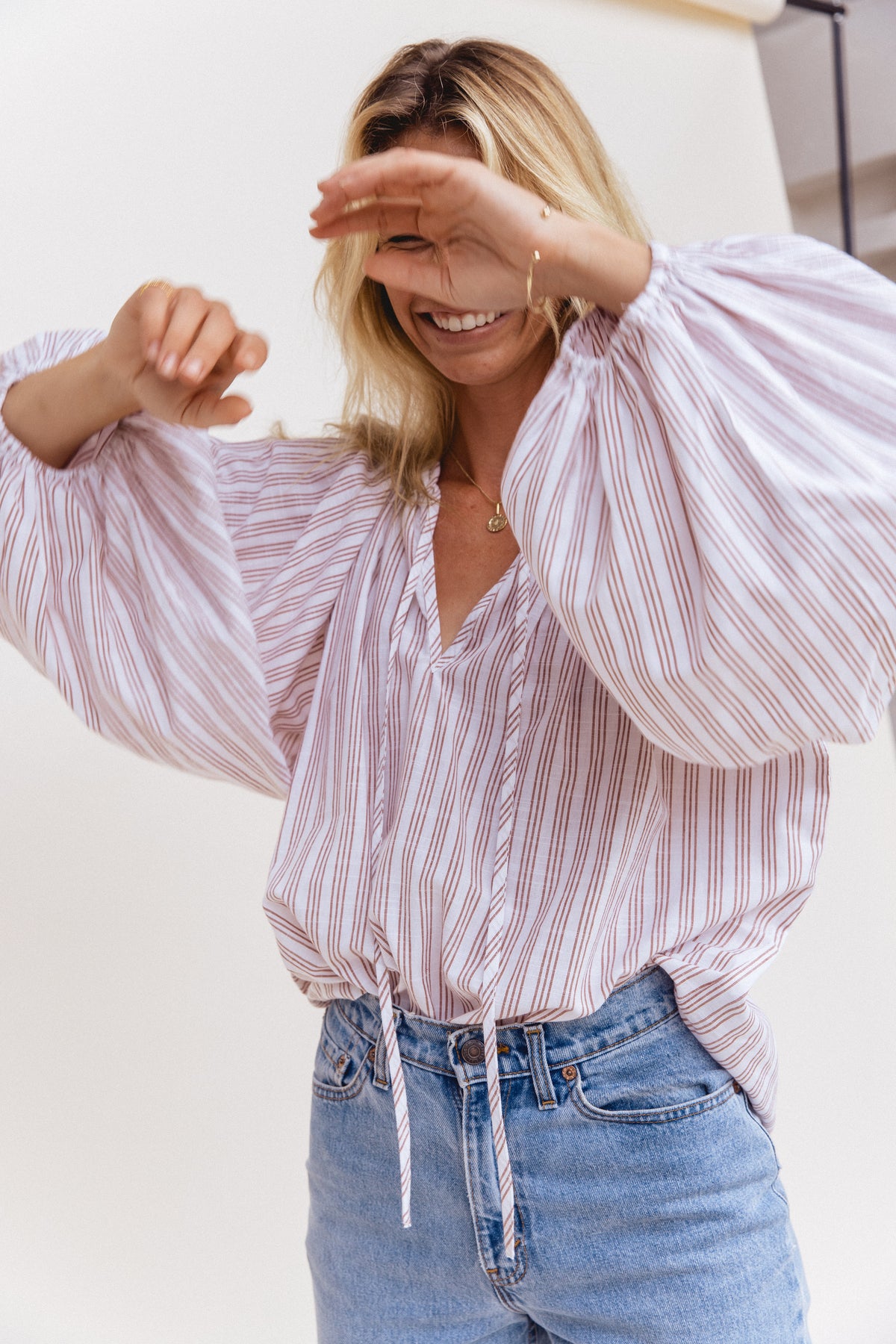 Inspired by a vintage silhouette, this elevated blouse has been crafted with handloom fabric ~ a rare and exclusive sustainably handmade textile in modern times. The beautifully soft hand-woven cotton features a light pink colour-way with pinstripe detailing in white, brown & yellow tones. While the shape offers a flowing oversized blouse design with a classic poet-style collar and optional front tie, and romantic billowy sleeves finished with soft elasticated cuffs.