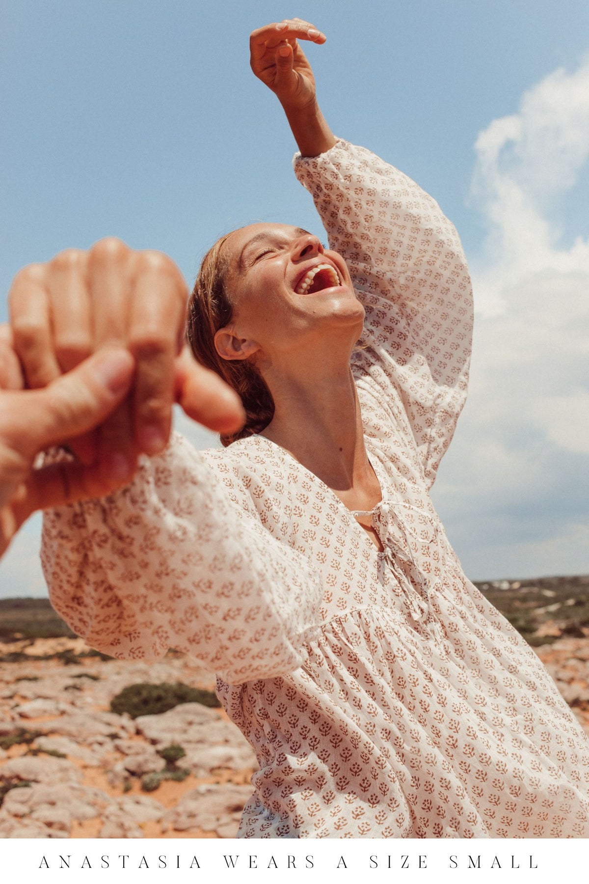 This divine cotton blouse is as light as can be. With the most romantic billowed sleeves, elastic cuffs, and two optional ties at the front. The flowing fabric features a sweet floral classic Indian Buti block print in cinnamon on soft white cotton. A timeless feminine piece.